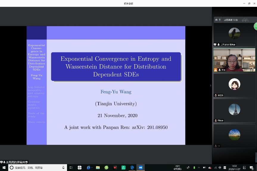 2020年11月27日上午,国家杰出基金获得者、长江特聘教授王凤雨教授受邀为williamhill官网师生带来了一场题为:“Exponential Convergence in Entropy and Wasserstein Distance for Distribution Dependent SDEs ”的学术报告。报告由williamhill官网统计与运筹系系主任罗雪副教授主持。