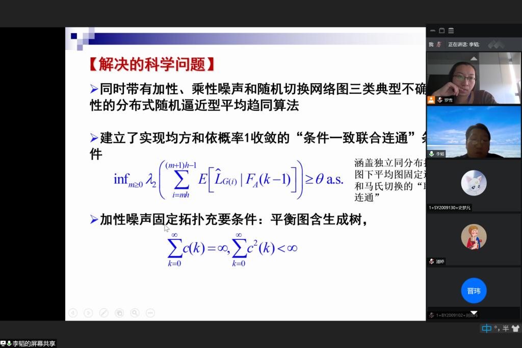本报告介绍了不确定通信环境下的协同估计与控制算法。对于随机图和随机噪声的分布平均,给出了随机图序列一致条件联合连通性的充分条件,以保证均方和几乎一致收敛。对于一致性+更新算法,证明了当观测矩阵和通信图满足随机时空持续激励条件时,算法增益可以被合理设计,使得所有智能体的估计收敛到均方的实数。针对具有部分可测状态和有限数据速率的线性系统的协同镇定问题,提出了基于量化观测器的通信协议和基于确定性等价原理的控制律,在一个集成的框架内描述了智能体间的通信和协作控制。对于带乘性噪声的随机同意性,根据智能体动力学的不稳定特征值、网络图和信道噪声强度,给出了显式的充分条件。李涛教授本次报告详尽而充实,参会教师就报告内容进行了激烈的讨论,同学们也都受益匪浅。