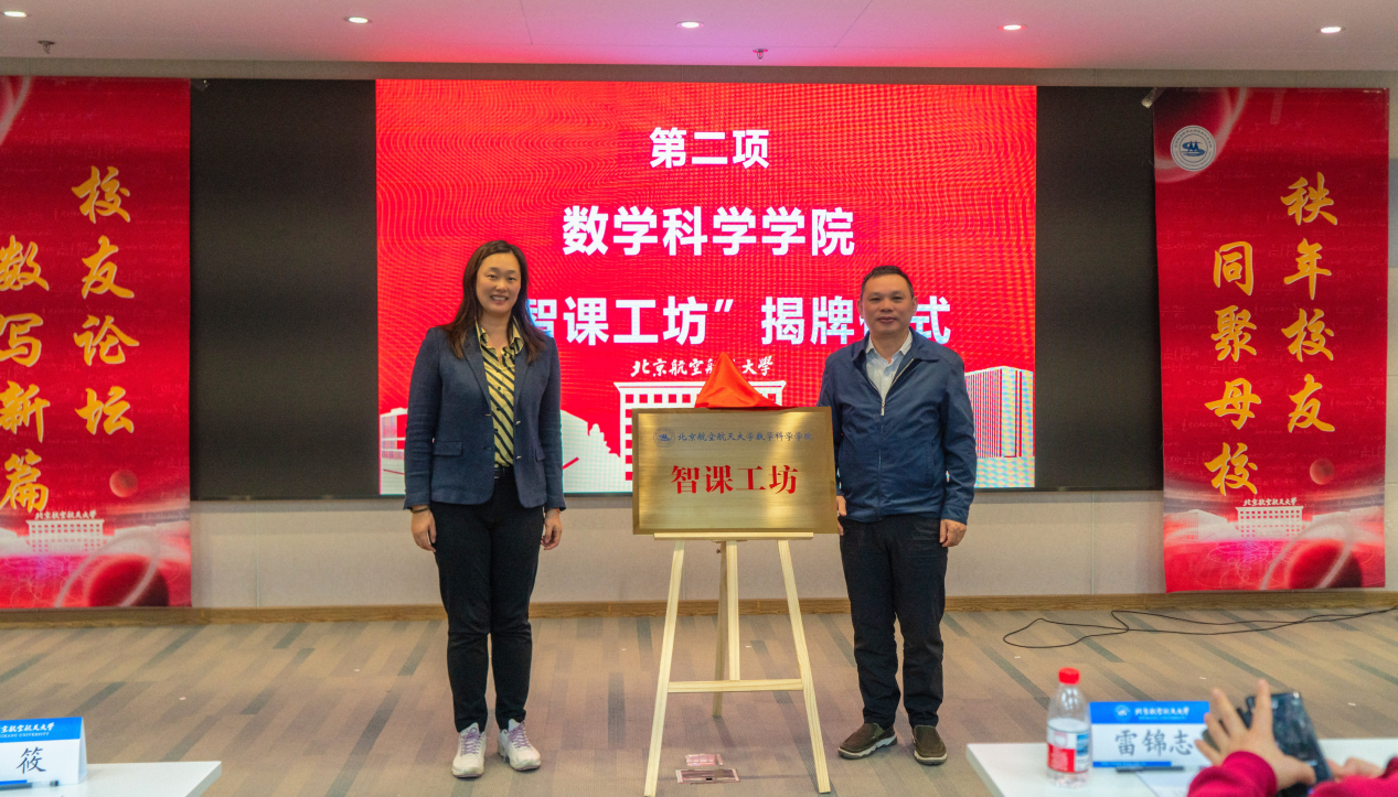 论坛现场,1991级本科校友张秋与张筱书记与共同为williamhill官网“智课工坊”揭牌。深圳锐取信息技术股份有限公司董事长张秋校友向学院捐赠11套数字化教学设备,学院特别成立“智课工坊”,将以捐赠设备做好数字化教学支撑,为数学拔尖人才培养全国首批虚拟教研室的建设积累数字素材,把北航数学教研模式推向全国。