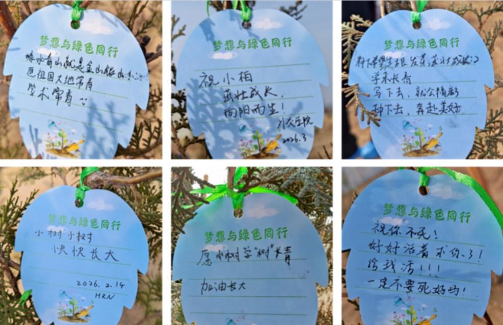 在全体同学的共同努力下,所有树苗均顺利栽种完成。同学们在树苗上系上心愿卡,并与树苗合影留念。